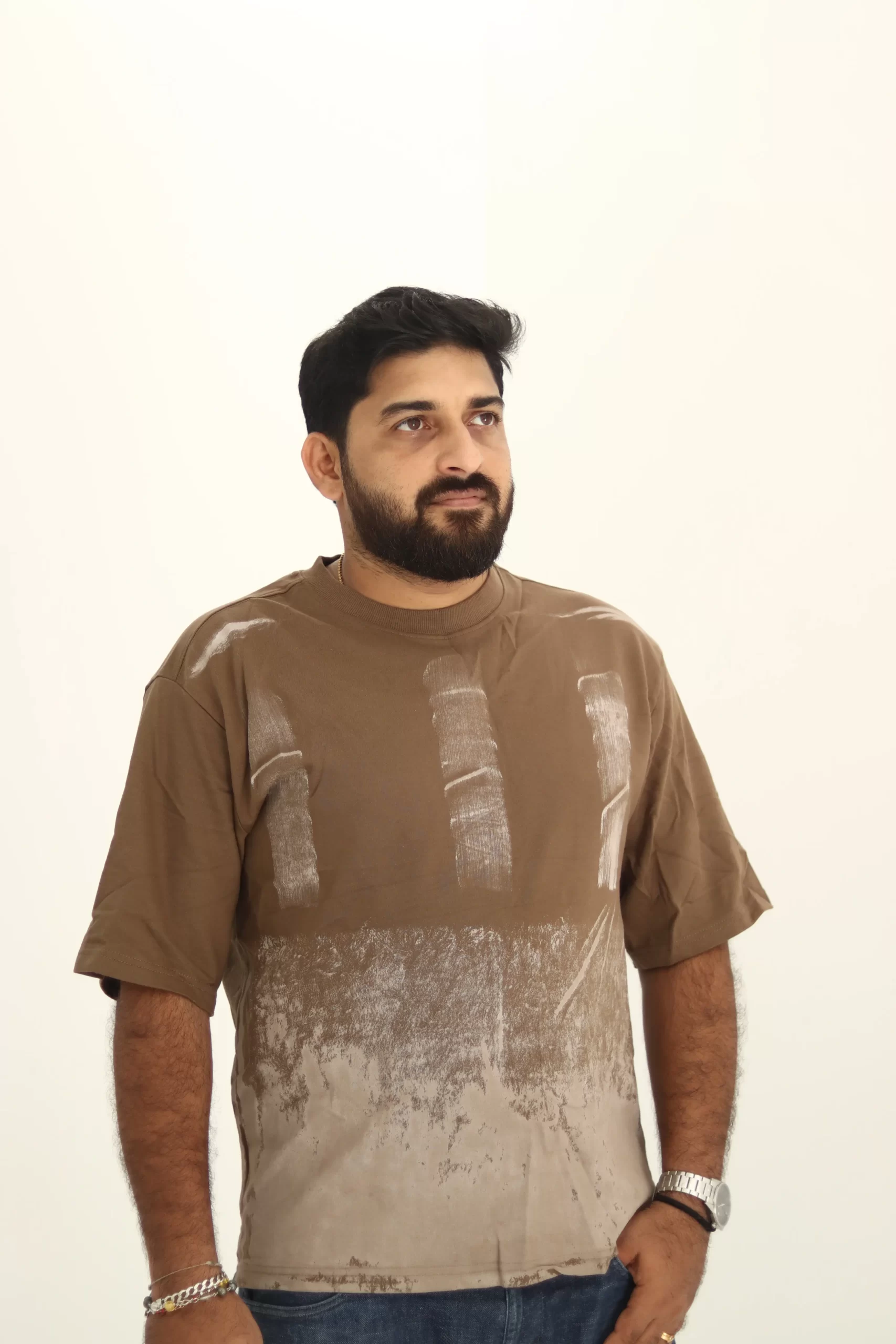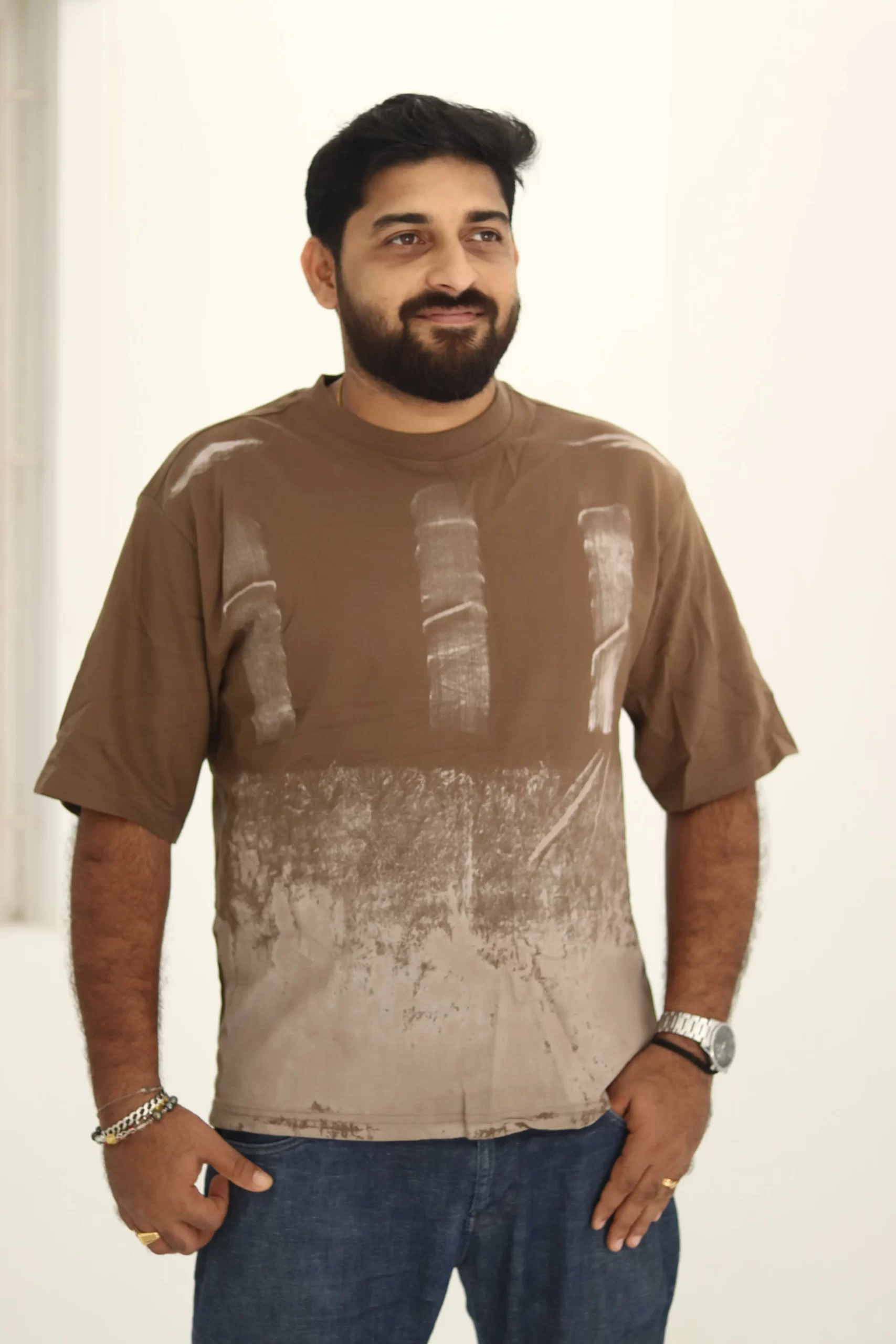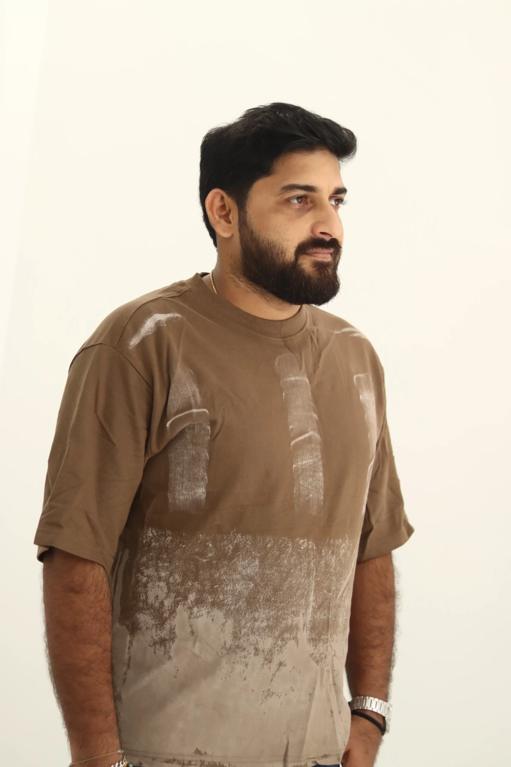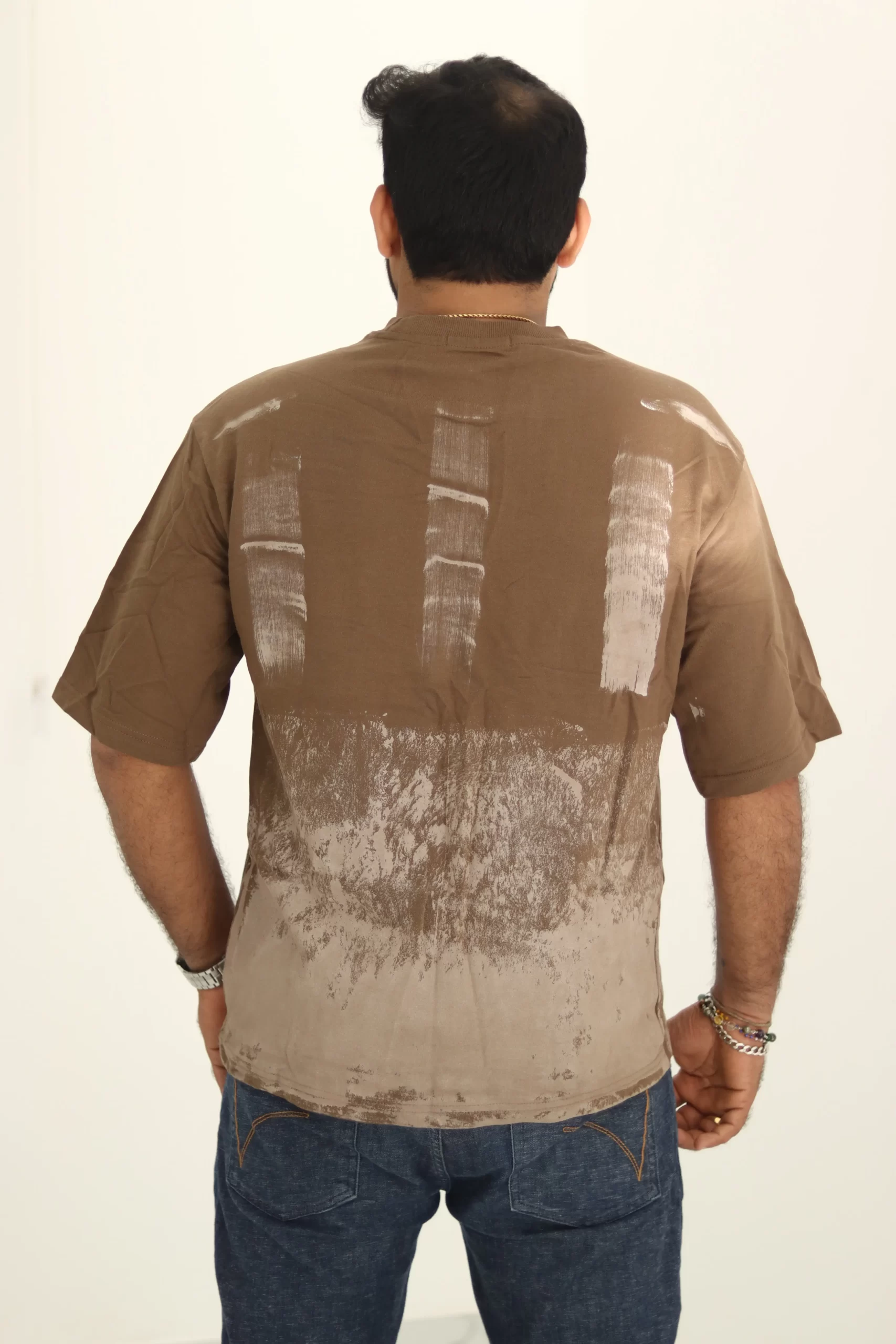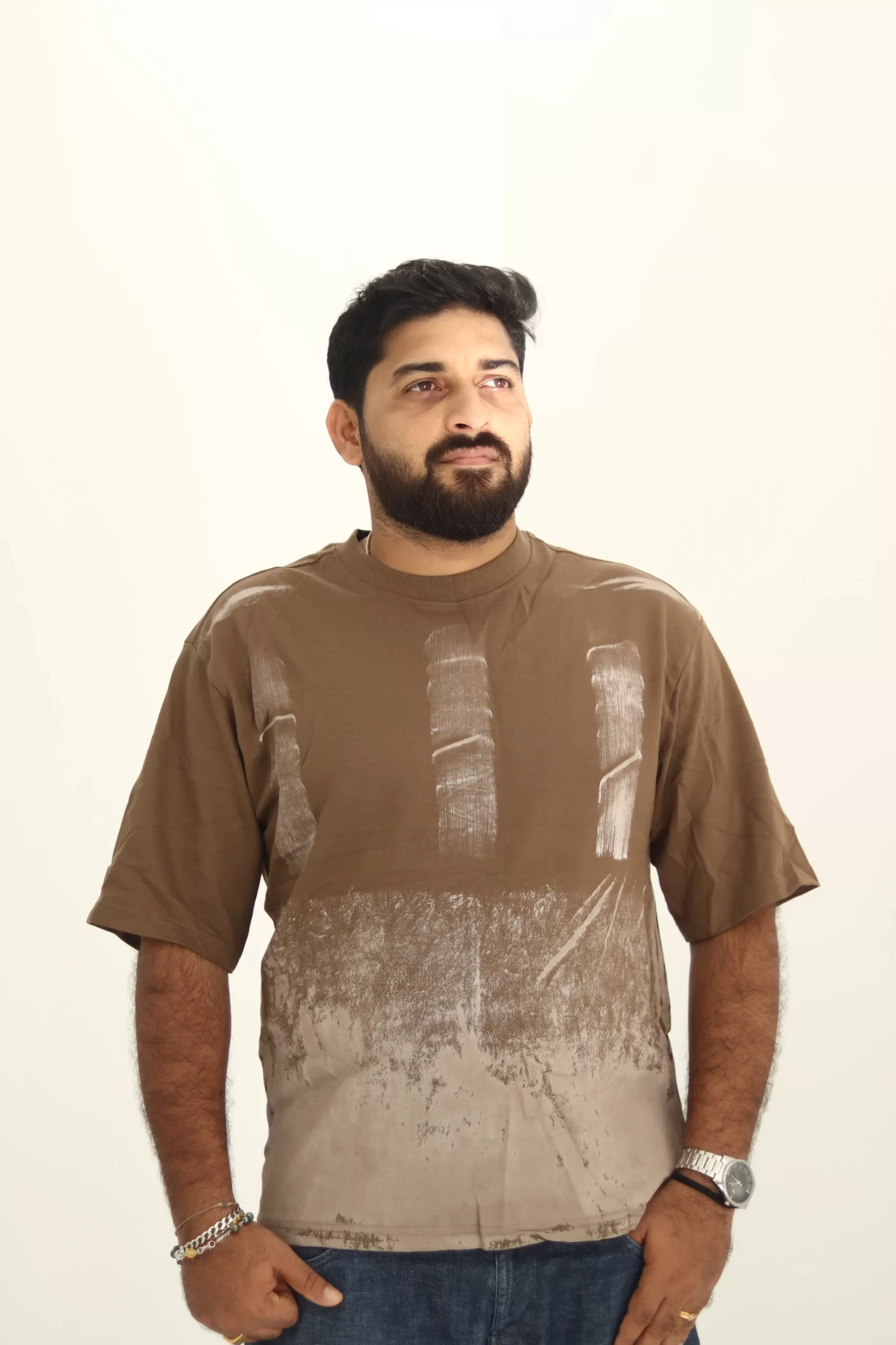 Refresh your wardrobe with this distinctive brown t-shirt, meticulously crafted from heavyweight 240 GSM French terry cotton for unmatched comfort and long-lasting quality. Featuring a bold, artistic brush print in contrasting earthy tones, this design delivers a modern streetwear vibe with premium craftsmanship.