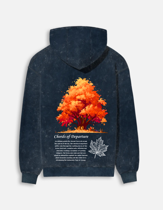More than just a graphic, this hoodie carries a story. The back features the poetic title “Chords of Departure,” accompanied by a verse about nature’s vibrant farewell and a delicate white sketch of a falling leaf. It’s melancholic, beautiful, and undeniably bold.