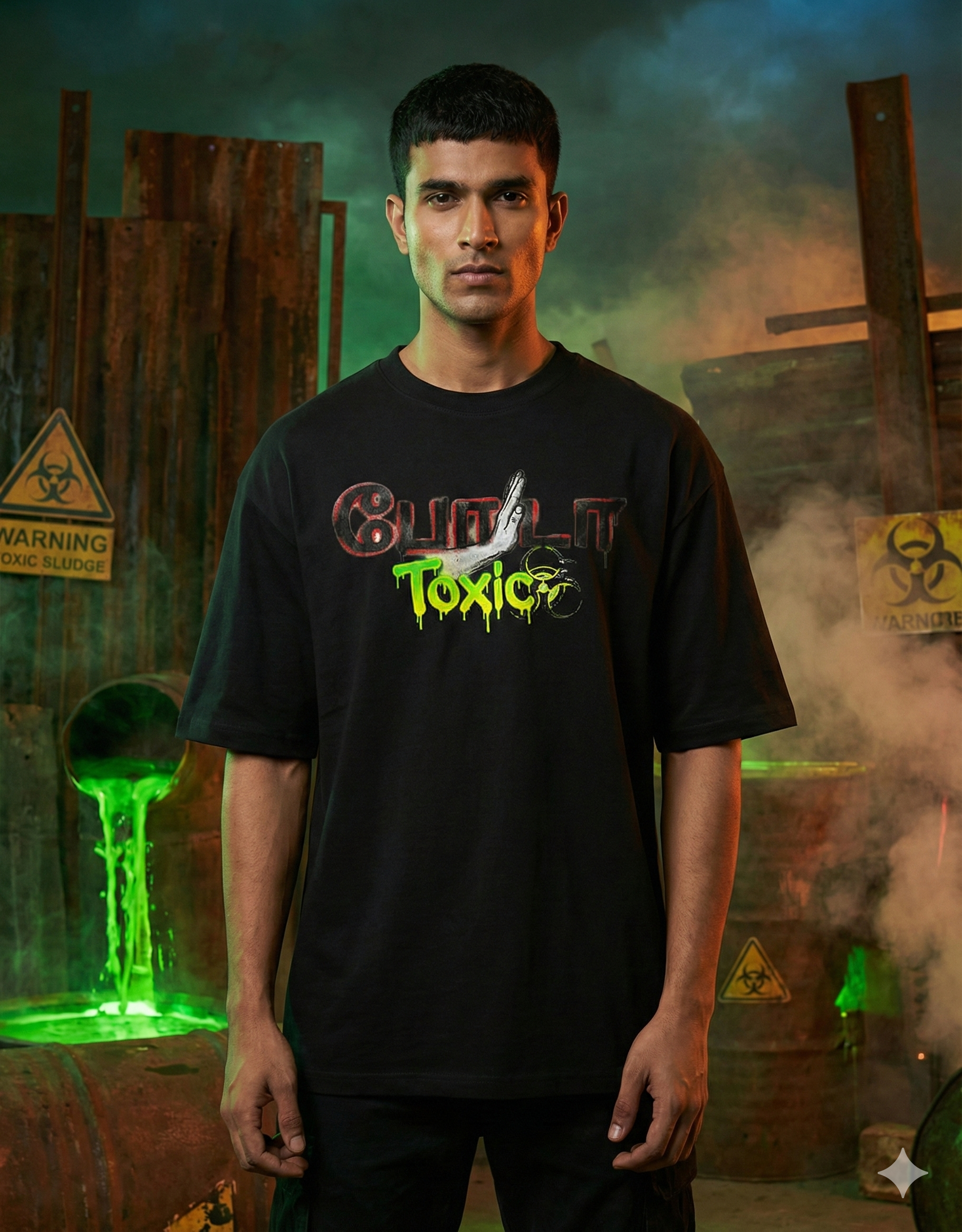 The JawDrop “Poda Toxic” tee is the ultimate shield against bad vibes. Featuring the dismissive Tamil command “போடா” (Go away) in gritty red, clashing with a radioactive slime-green “Toxic” graphic, this is wearable attitude. Complete with biohazard symbols and a “stop” hand gesture, it’s a clear sign for the negativity to keep walking.