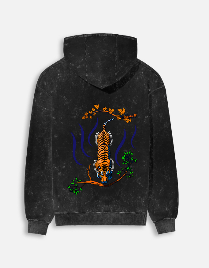 But the real showstopper is on the back: a vibrant, high-definition graphic of a tiger cutting through the current, bridging the gap between seasons. It’s loud, it’s detailed, and it’s designed to turn heads. Throw it on, hood up, and let the back do the talking.